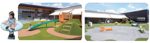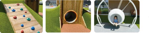 ローラー滑り台のある築山遊具や、カラフルでかわいい形の遊具が遊び心をくすぐる。誰もが楽しめるインクルーシブ遊具もある。