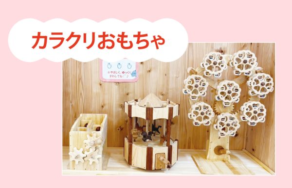 たくさんの木のおもちゃや遊具に囲まれて、木のあたたかさや心地よさを感じながら思いっきり遊べるプレイルーム。木の香りや感触など五感を通じて木と触れ合うことで、豊かな感性を育むとして注目される「木育」が取り入れられている。めずらしい木のおもちゃや、市内の工房さんのカラクリおもちゃなど、乳幼児から就学児までが飽きずに遊べる工夫がいっぱい。専門家をはじめ、市内の保育園や3つの子育て支援センターの保育士なども参加して、安全面や独創性などの観点から選び抜かれたおもちゃです!