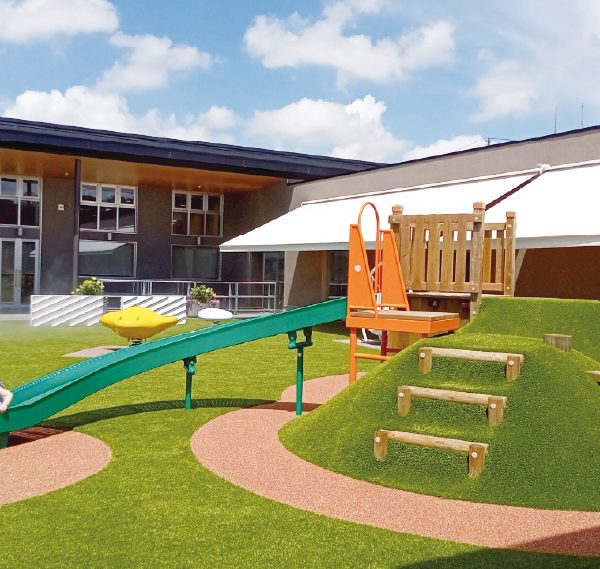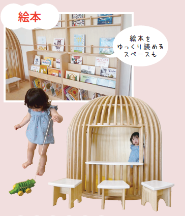 乳幼児と就学児とが安心して遊べるように緩やかに分けられた遊び場。乳幼児用のおもちゃに加え、所々に楽しい仕掛けが。窓からの眺めも良く、自然を感じながらゆったりとした気持ちで過ごせる。