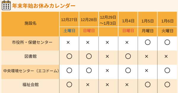 12月31日(水)から令和8年1月3日(土)はごみと資源物の収集がお休みです。3月号の折り込みで配布した「ごみと資源のカレンダー」や市ホームページを確認し、計画的なごみの排出にご協力をお願いします。