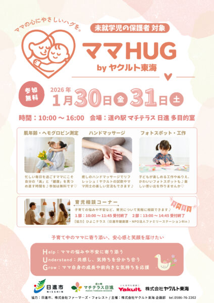 【ママの心にやさしいハグを。】子育て中のママに寄り添い、安心感と笑顔を届ける未就学児の保護者向けのイベントが開催されます!ぜひ遊びに来てくださいね!■開催日:2026年1月30日(金)・31日(土) ■時間:10:00から16:00 ■場所:道の駅マチテラス日進 多目的室 ■参加費:無料